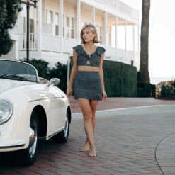 Model Sophia is 5’6″, a size 2, and wears an XS