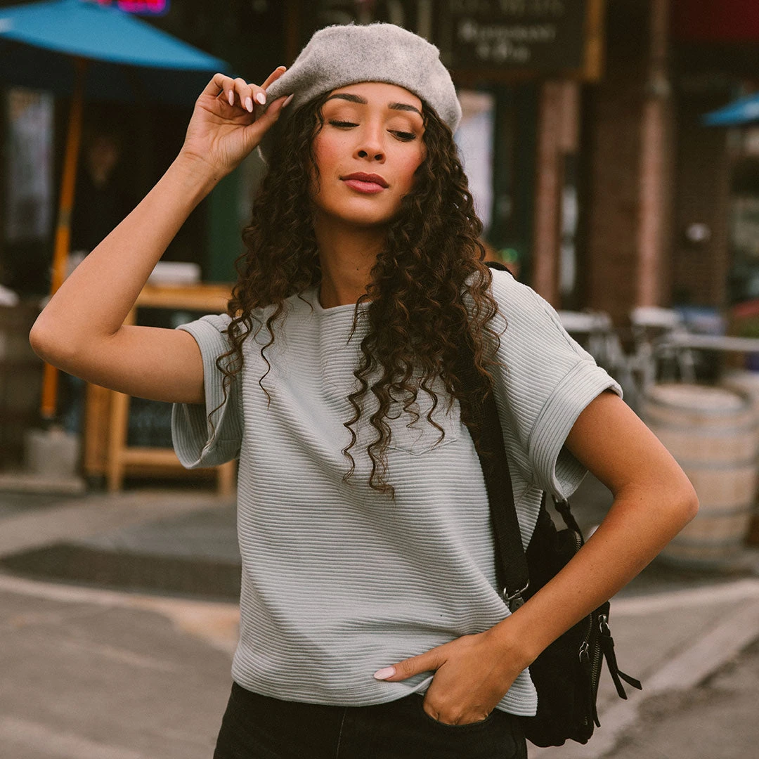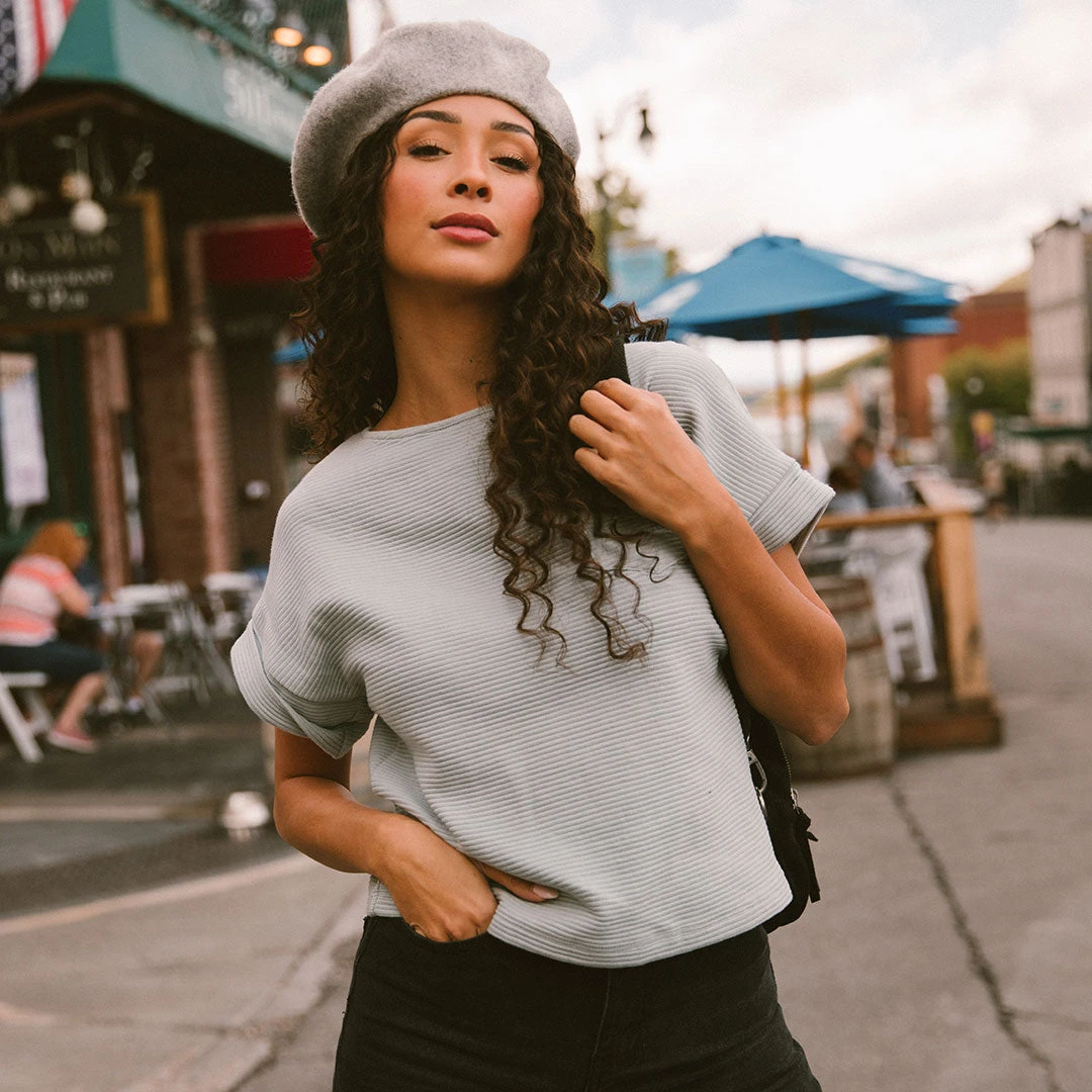 A soft tee, but in disguise! With a ribbed fabric and a statement sleeve, no one will ever guess how comfortable this grey blouse is. Pair it with a