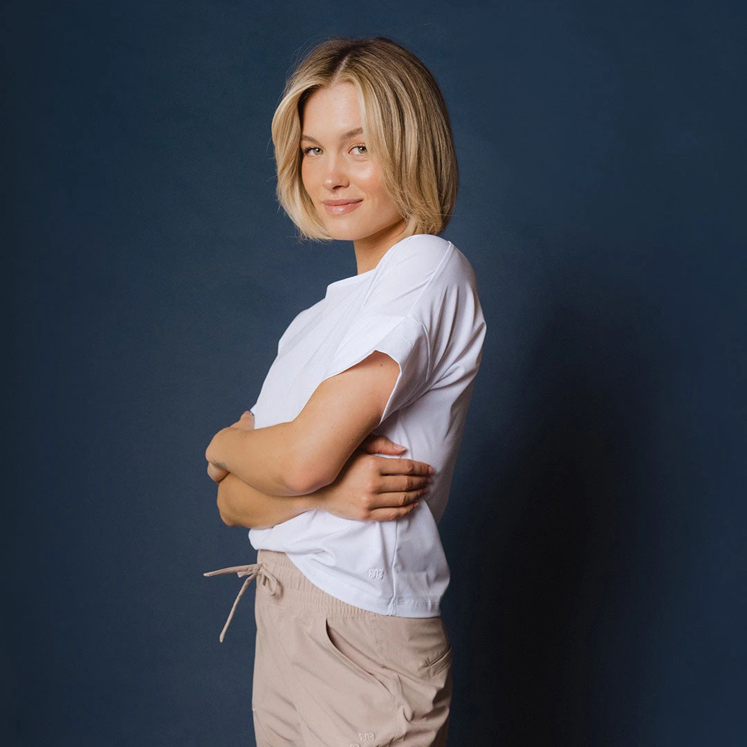 You asked, we answered! Our favorite Boss Crop Tee in a bright, goes-with-anything white. A great work piece, this white cropped blouse has a smooth boatneck, loose fit, and pairs amazingly with