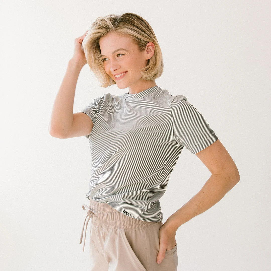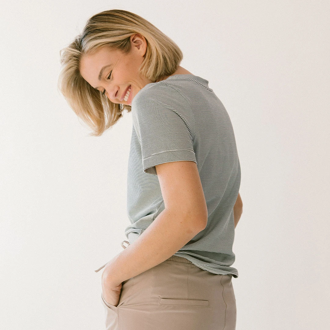 A classic, no-nonsense tee in one of Albion’s signature prints: Sweet Stripe! Our women’s Boyfriend Tee has a slightly longer sleeve and a comfy relaxed shape that hits at the hip, with a material so soft you won’t believe it.Â