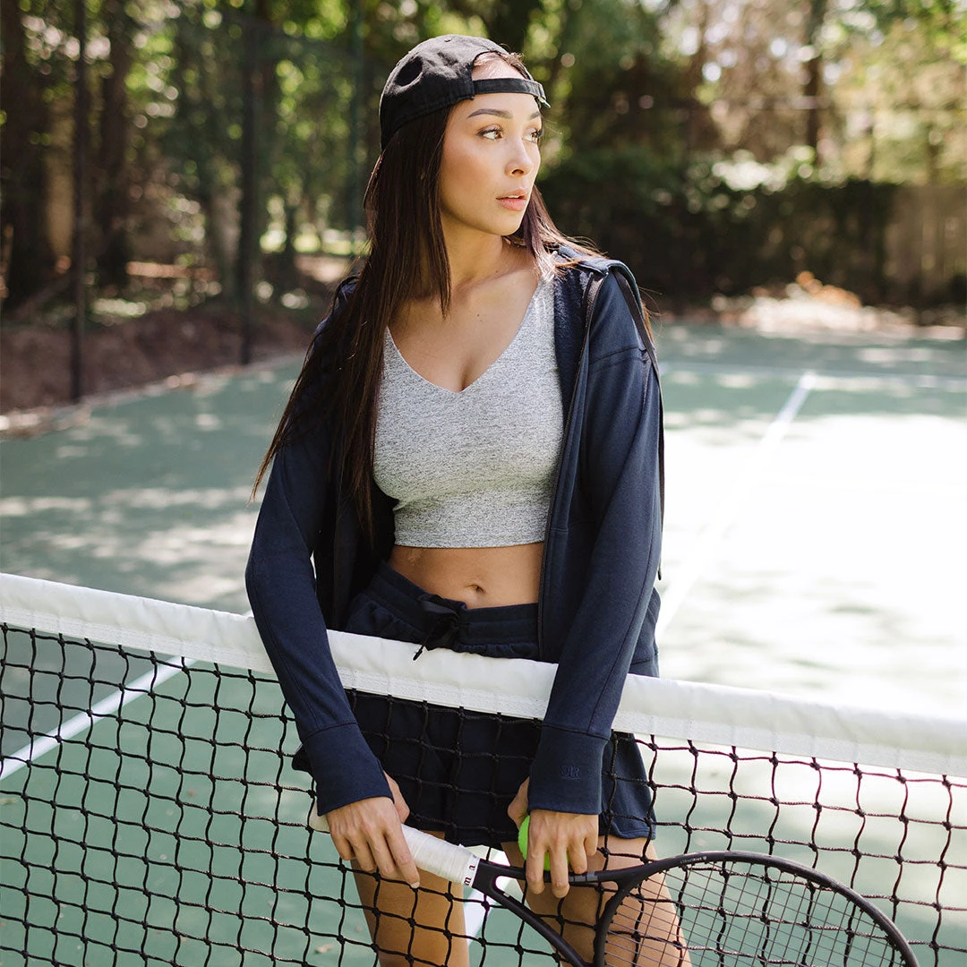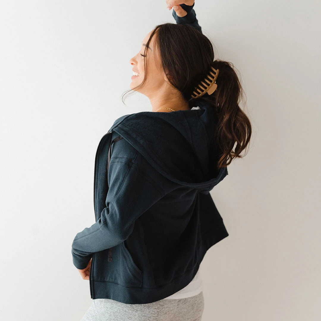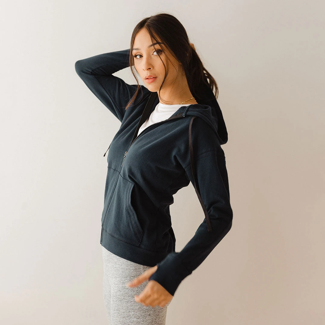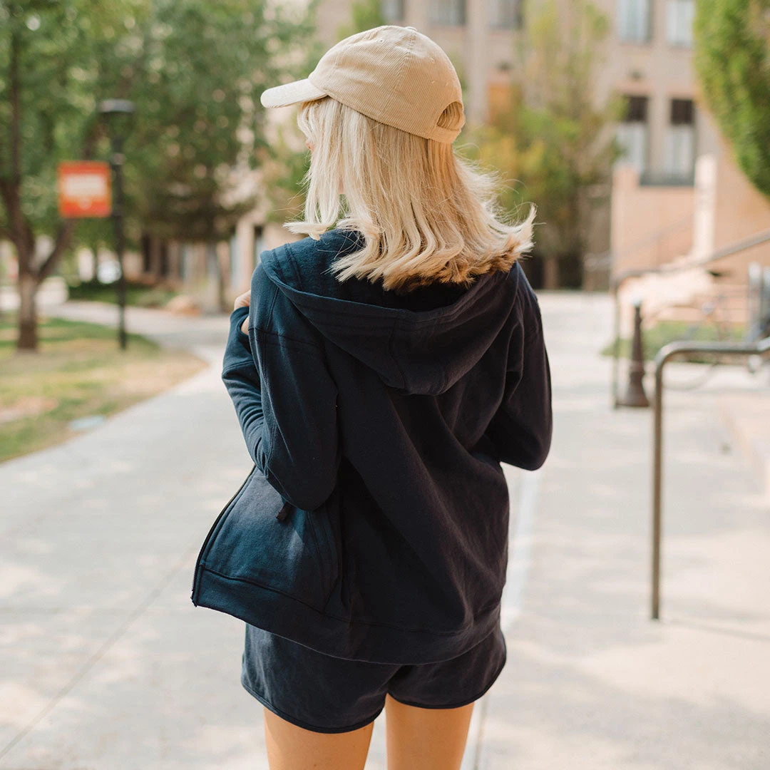 Your new favorite go-to sweater is here! This navy zip up hoodie goes with any outfit, and is perfect for layering on a cold morning, and stashing in your backpack in the afternoon. Stay cool on campus in this hoodie with reinforced thumb holes, a wide, flattering hood, and contrasting black zipper and strings.