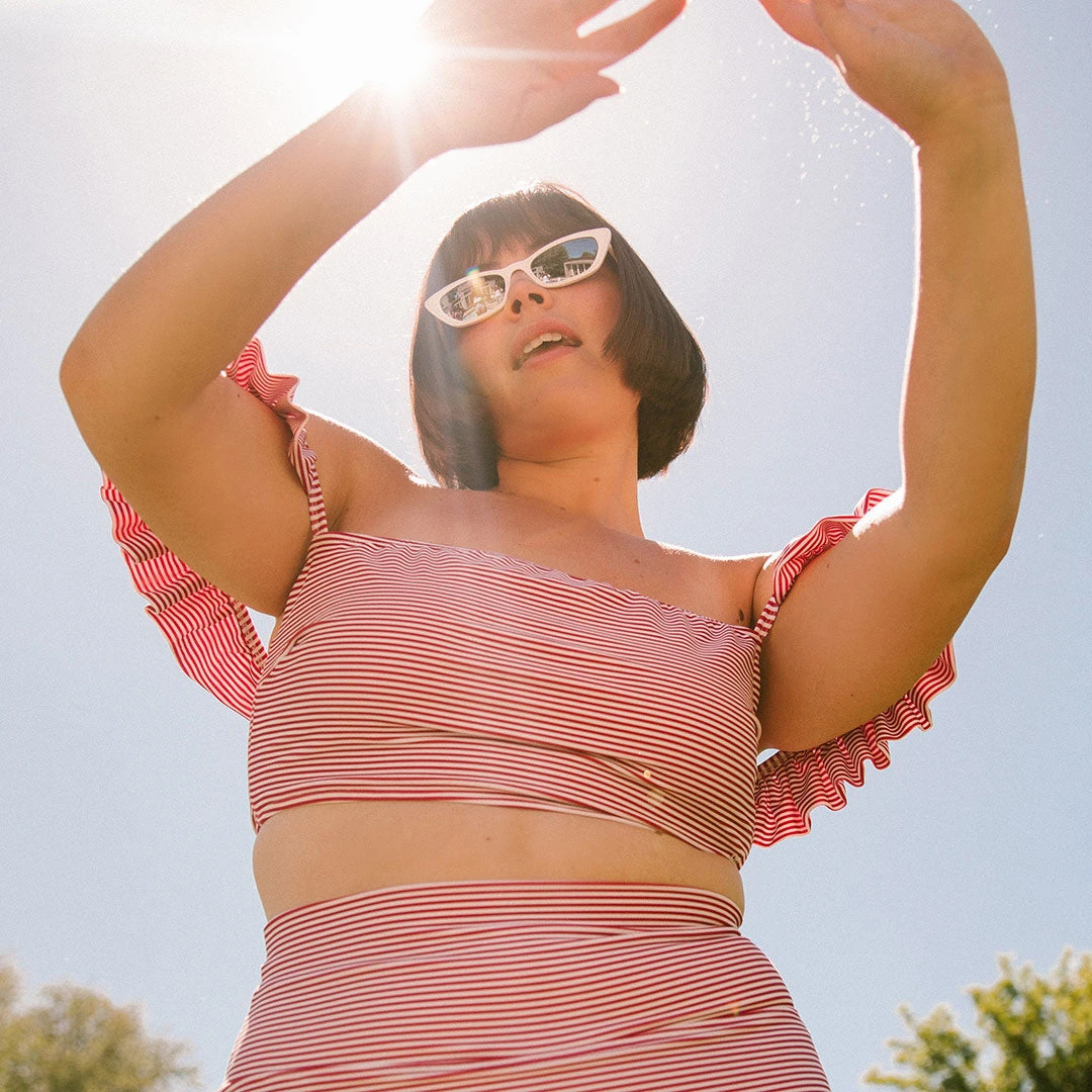 Nothing is more “summer” than these patriotic stripes! Our red pinstripe swimsuit top features an adorable ruffle that is perfect as an off-the-shoulder look or a supportive bikini strap.