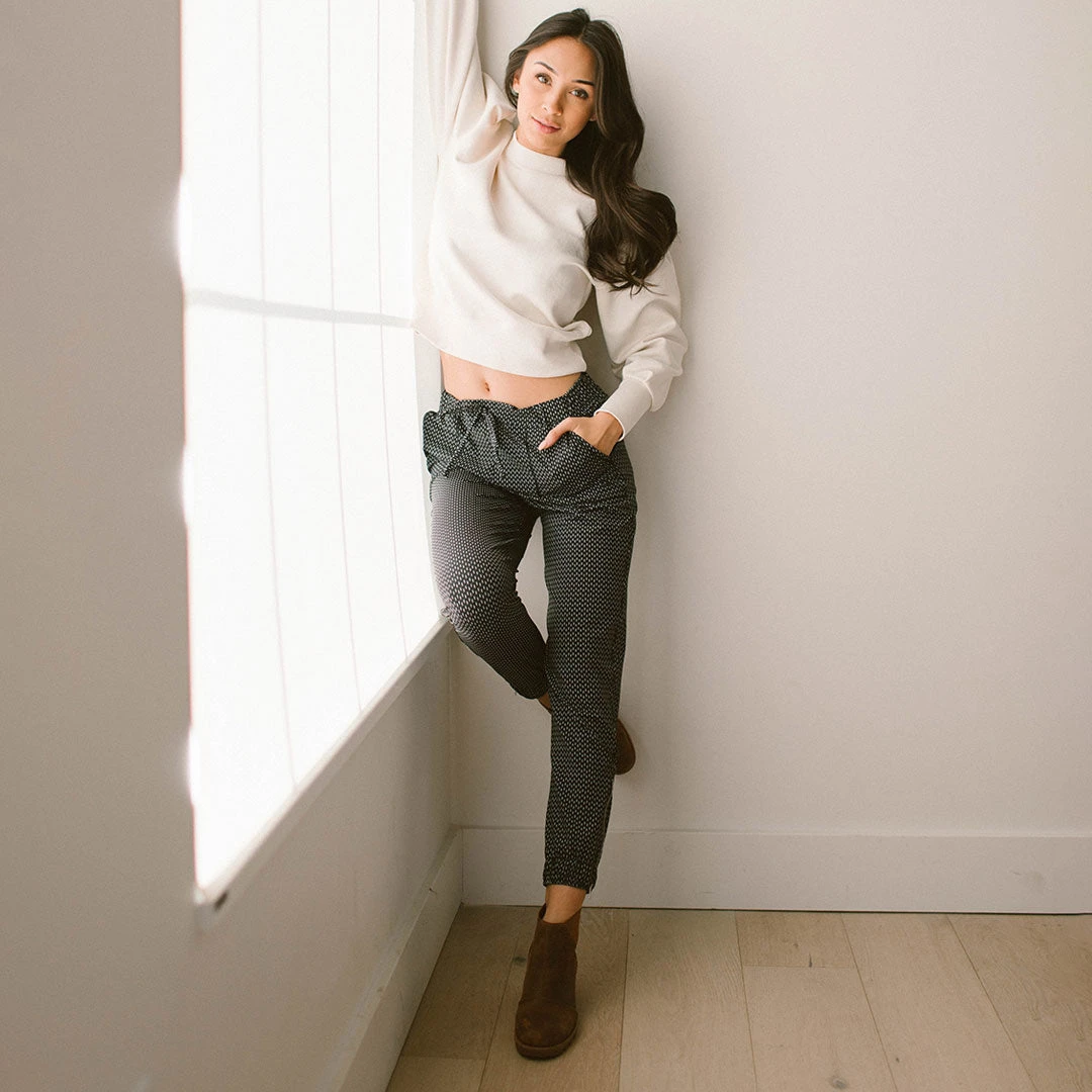 Sophia is 5’10”, a 25 pant size, and wears an XS