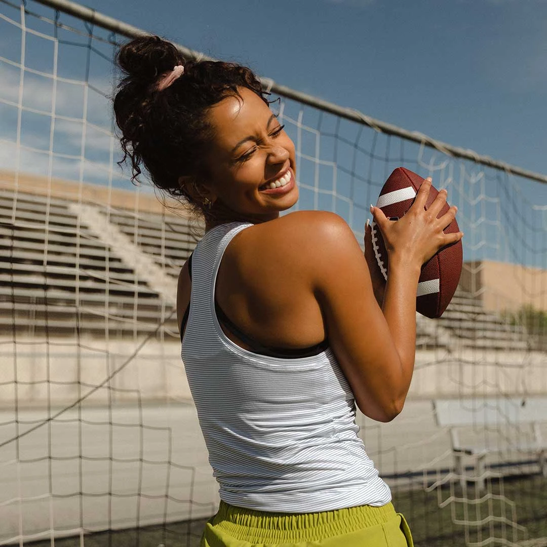 Ready. Set. GO in our racerback Exhale Tank! This women’s workout top is breathable, soft, and stretchy. Plus, its dusky blue stripes add the cutest detail to any gym fit.