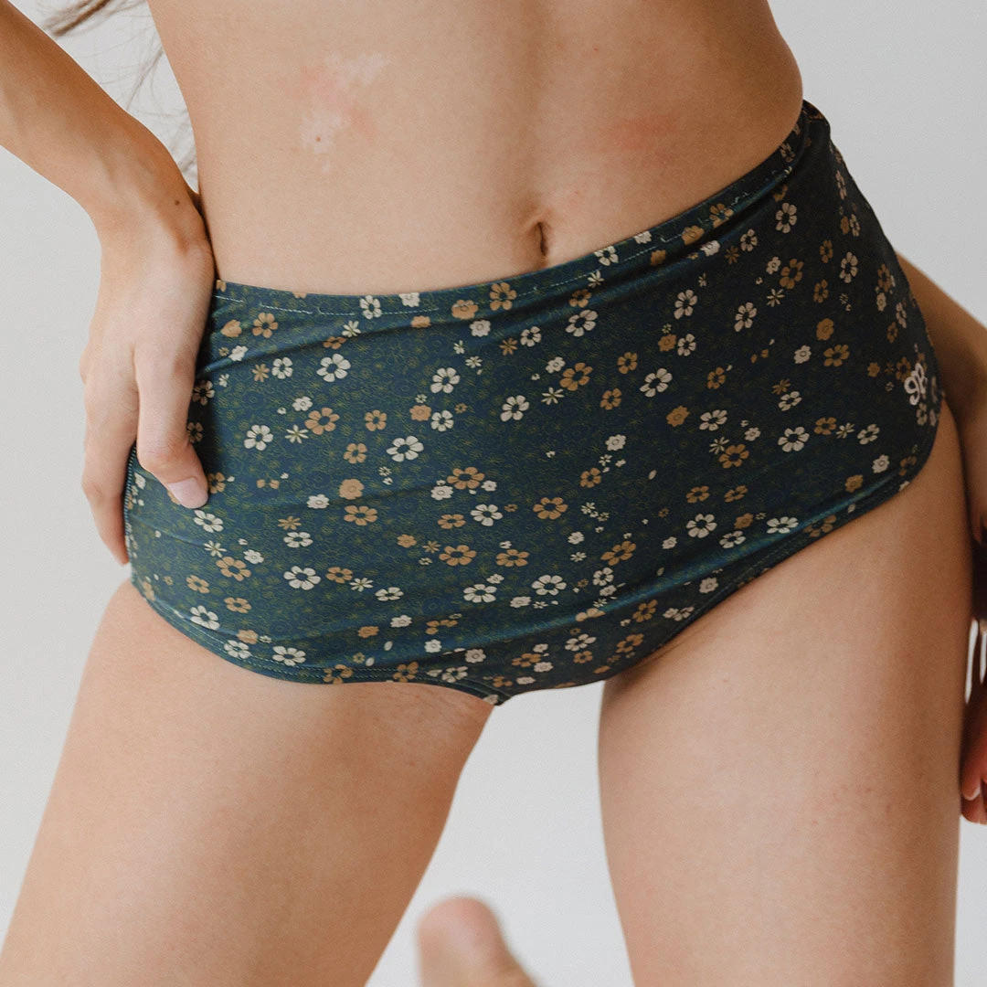 In the most gorgeous moody colors, our Flora bottoms are taking the swim world by storm! We love these high-waisted bottoms for their compressive feel and stay-in-place style. Plus, how cute is this microfloral print!Â