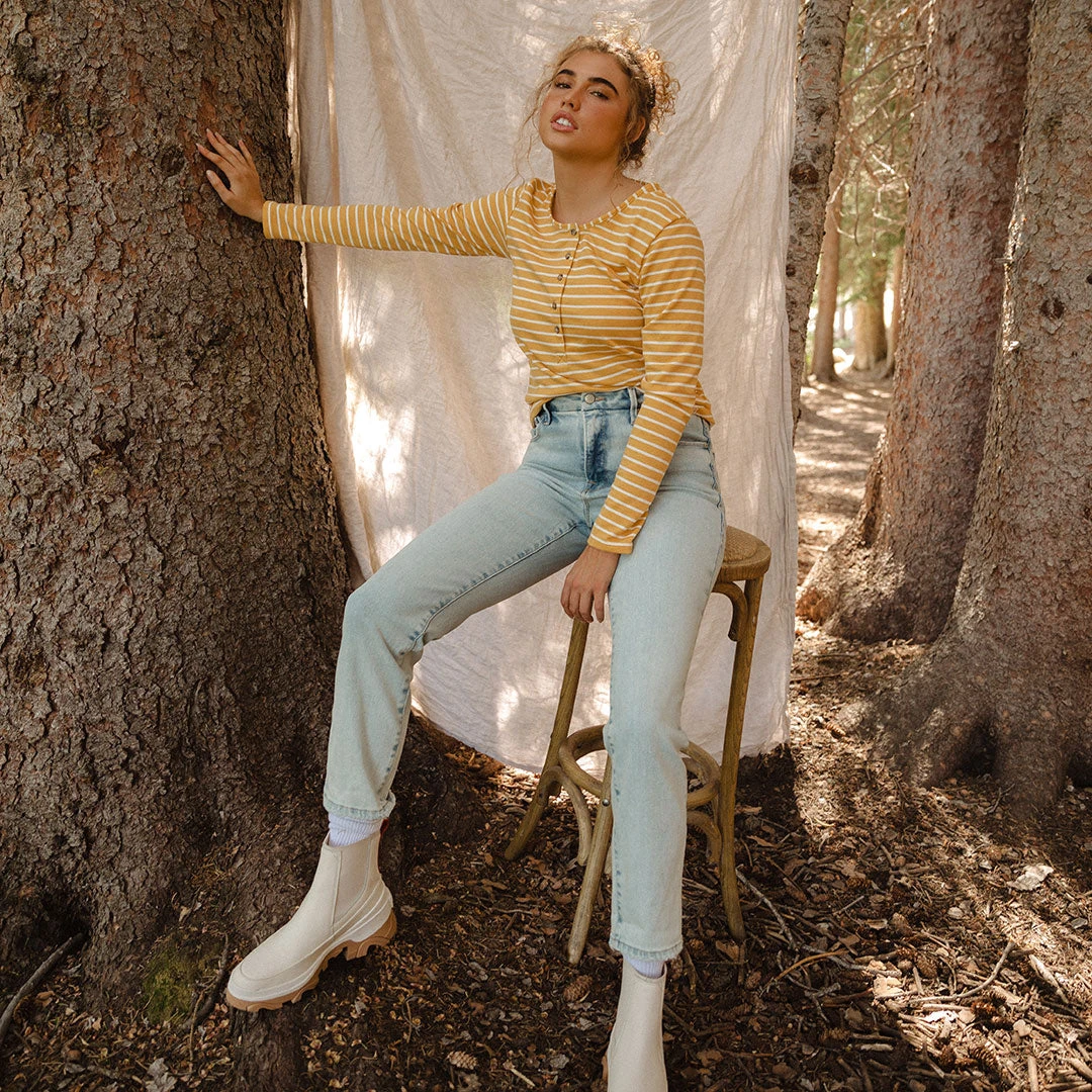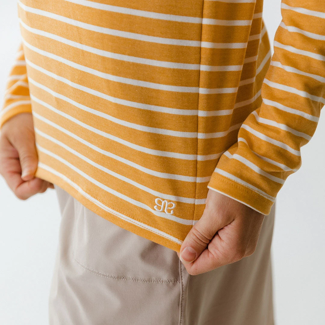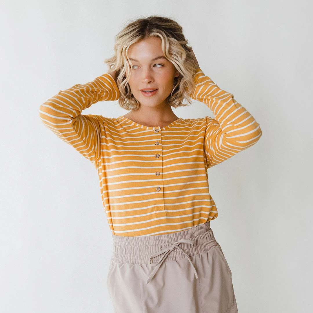 An Albion take on a fall must-have: the Henley tee! Long sleeves keep you oh-so-cozy, with the option to button up or down to fit your style. Off on an adventure? Henley tee! Cozying up by a fire? Henley tee! Golden yellow stripes make this one a favorite for cloudy days!