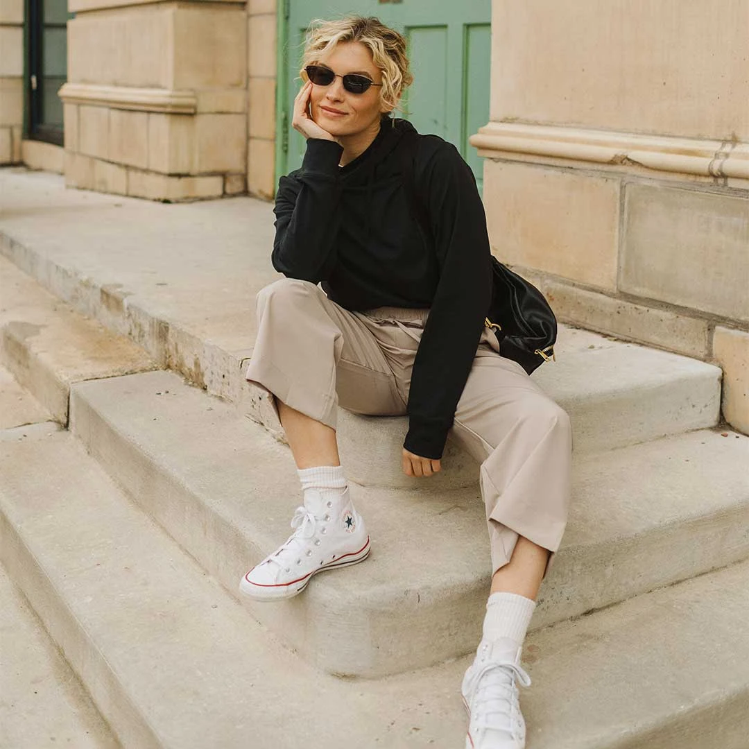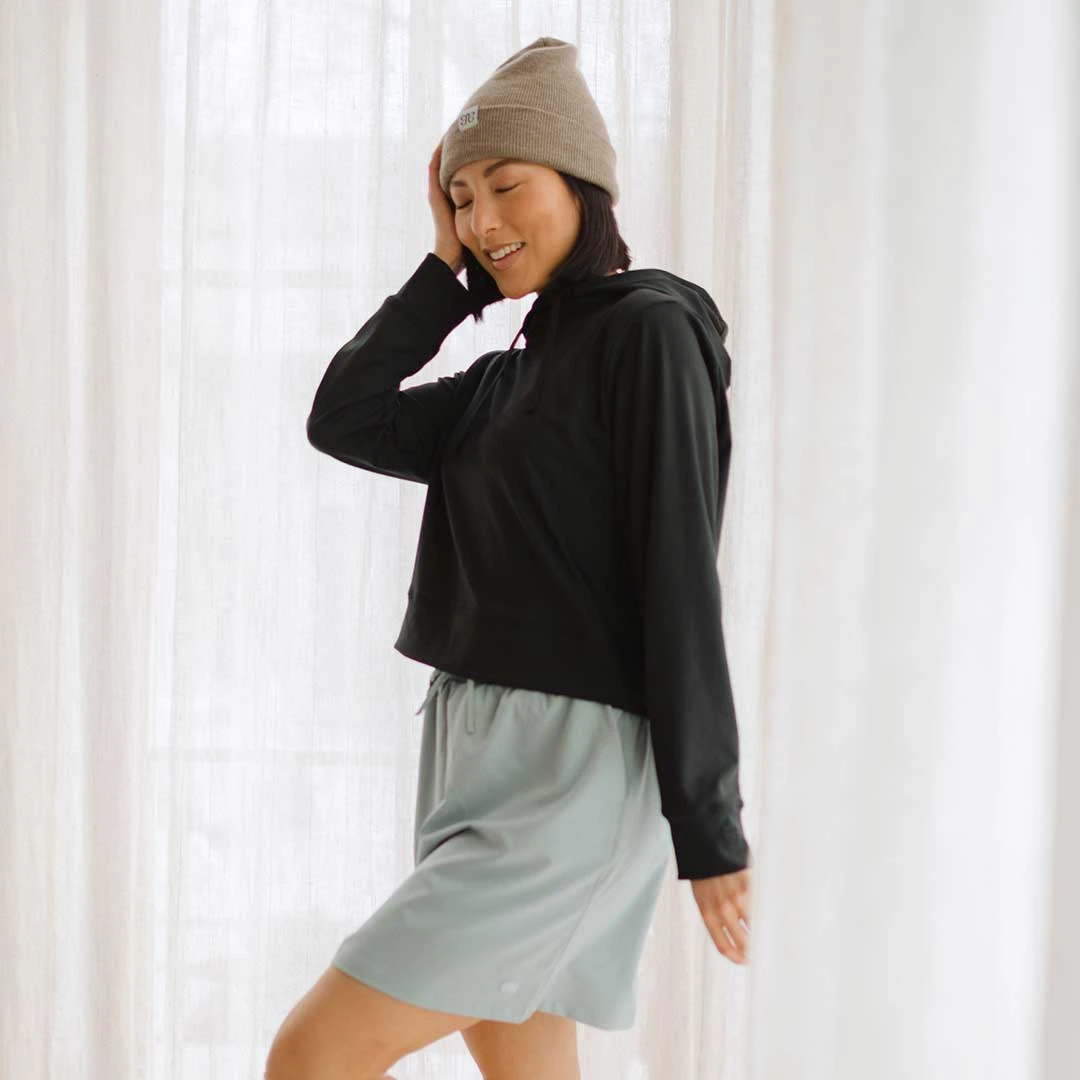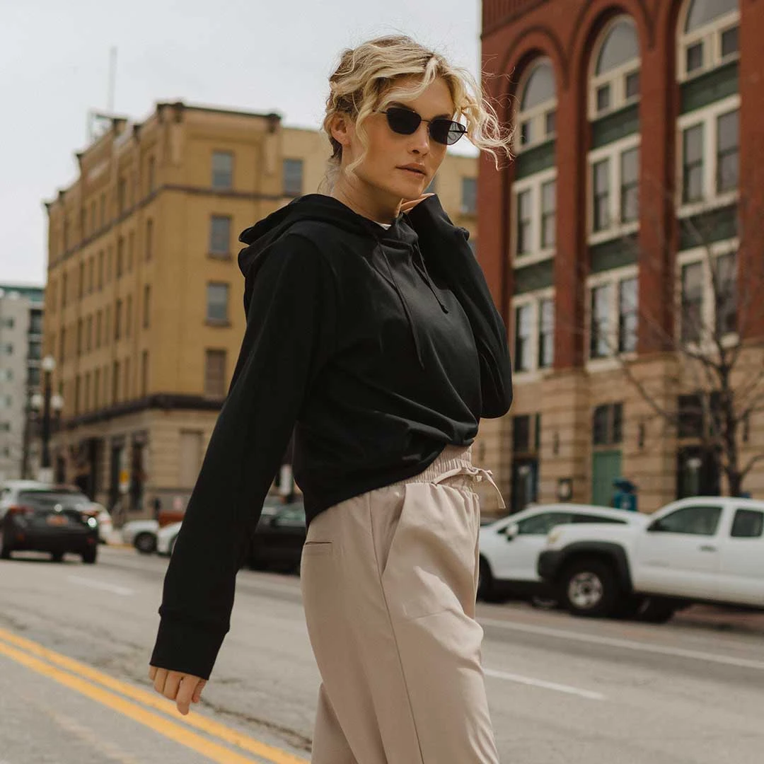 The perfect hoodie to throw on anytime, anywhere. With a slightly cropped fit and the cutest fabric drawstrings, this hoodie can be worn long after your workouts over! Plus, this black shade goes with everything!