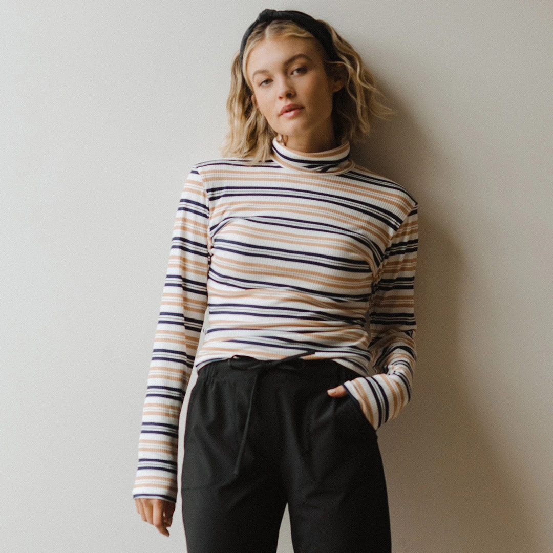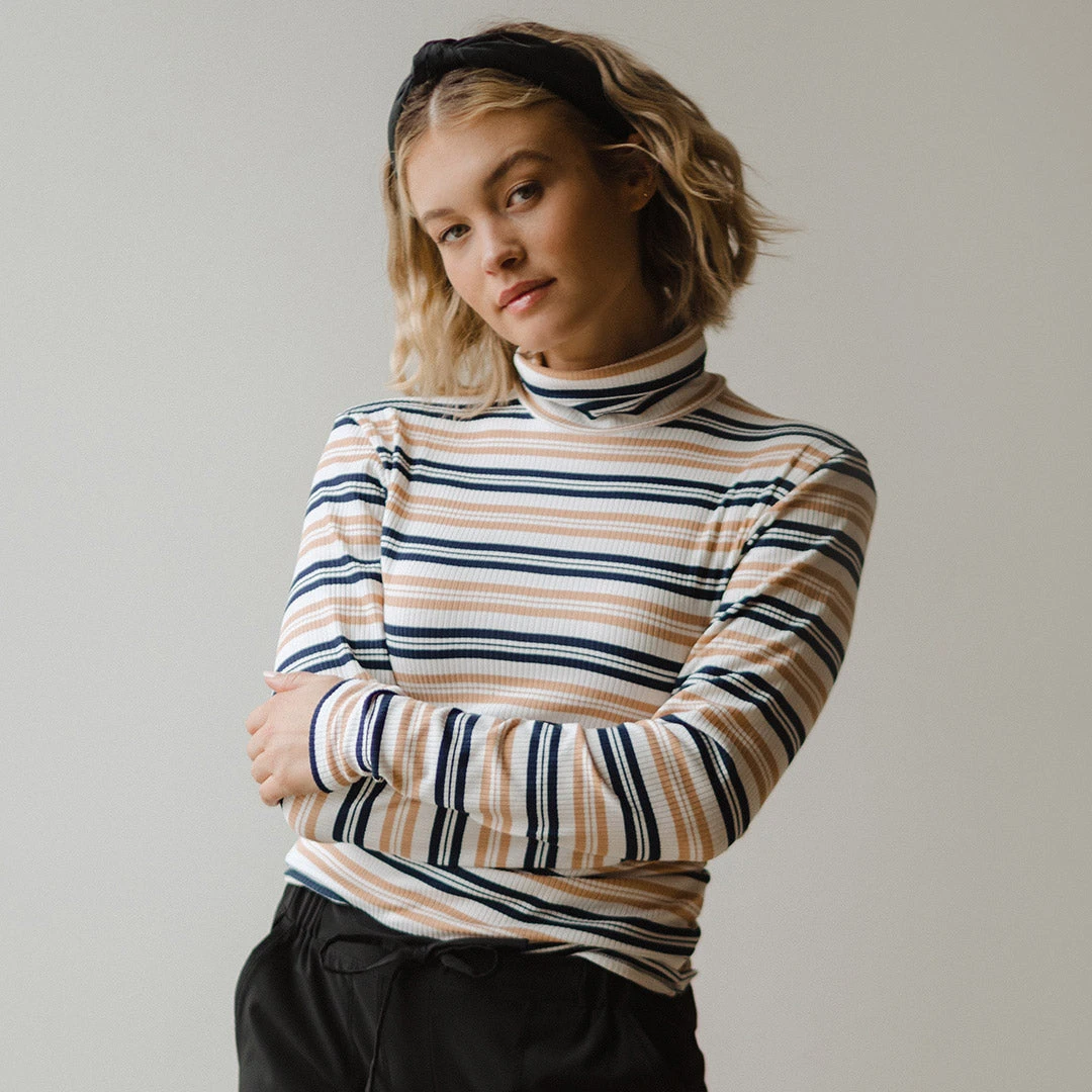 This striped turtleneck tee is going to be your go-to this season! Perfect for layering or pairing with your favorite Albion bottoms, we are loving this for any occasion. A classic style you can wear for years to come.