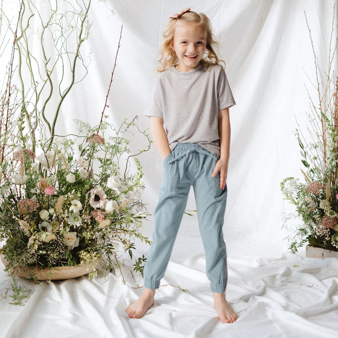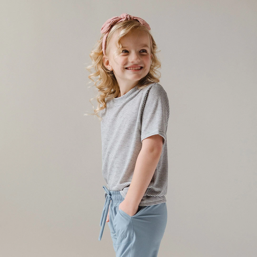 Our best-selling tee in MINI! Made with super soft rayon spandex, this tee hits mid-length with a relaxed and flattering fit. This micro grey stripe tee has a crew neck and is something that she can wear anytime, anywhere, and with anything.