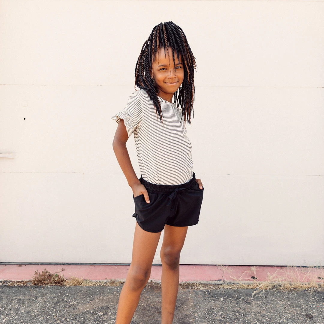 Mini Sprinter Shorts with the perfect length, featuring an elastic drawstring waistband and pockets! In classic black, these shorts allow her to move and play with ease. Skip, run, twirl, or jump – these shorts will take her on all of her adventures in comfort and style!