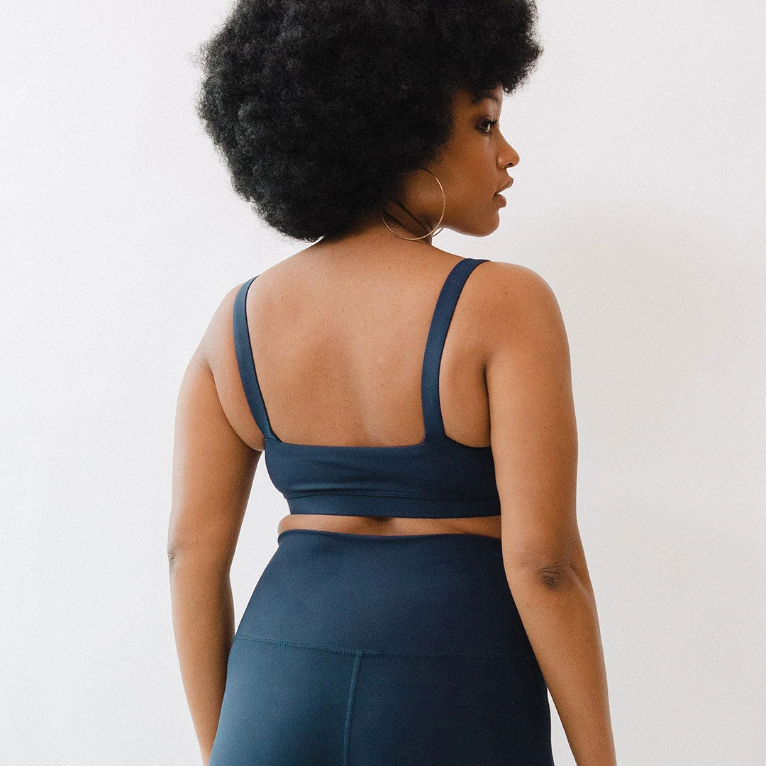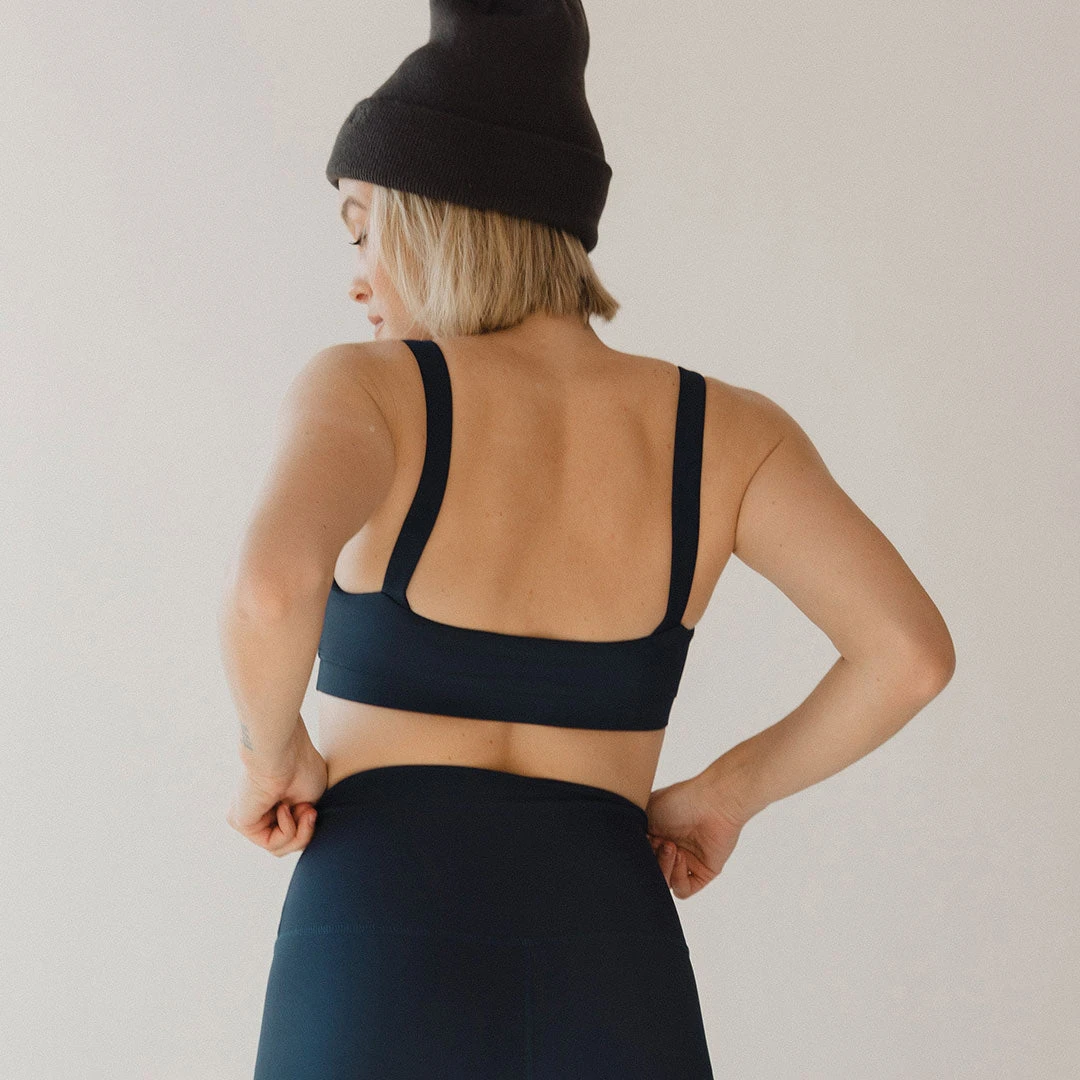 Meet our Navy Momentum Bra, a workout/swim top designed to maximize your comfort AND confidence. With thick straps and a sturdy waistband, this bra will stay in place all day long!