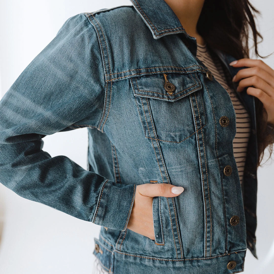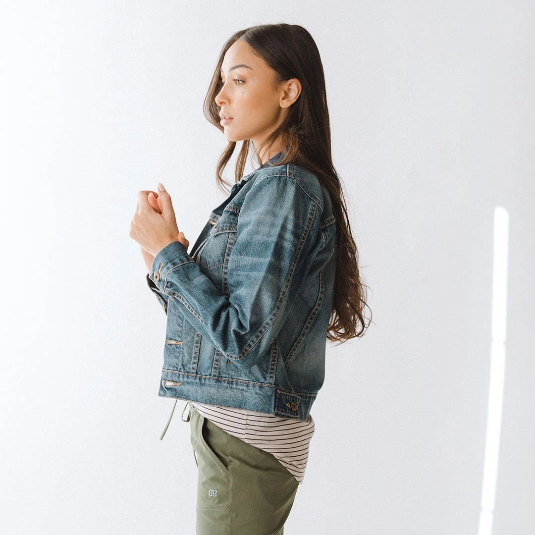 A new Albion favorite! This classic denim jacket is everything you want in a closet staple: mid length, comfortable, and goes with anything! Stay true to size for a classic fitted look, or try a size up for an oversized style. Denim is totally a neutral—this comfortable denim jacket pairs perfectly with
