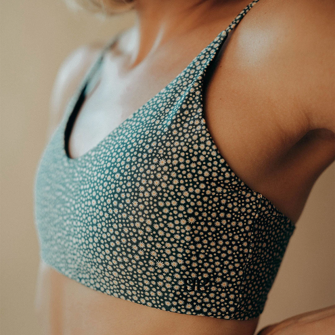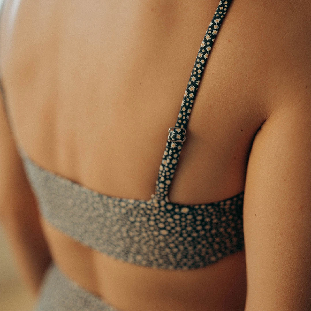 A sports bra and swim top in one! The silky soft material and adjustable straps will make this your go-to swim top for any occasion. This top features a black background with cream and yellow mini florals.
