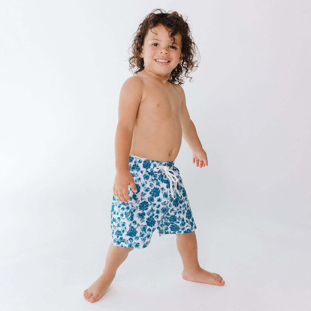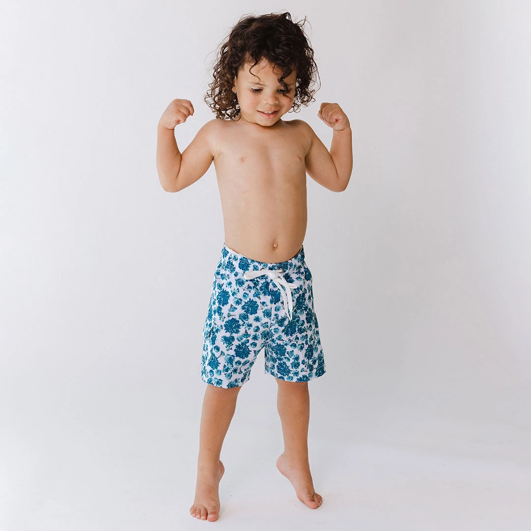 A tropical floral that your little dude can rock all summer! Santorini has been a crowd favorite this year, it’s bright blue print makes a perfect match for these mini swim trunks. Get ready to match the whole family, because Santorini is available for