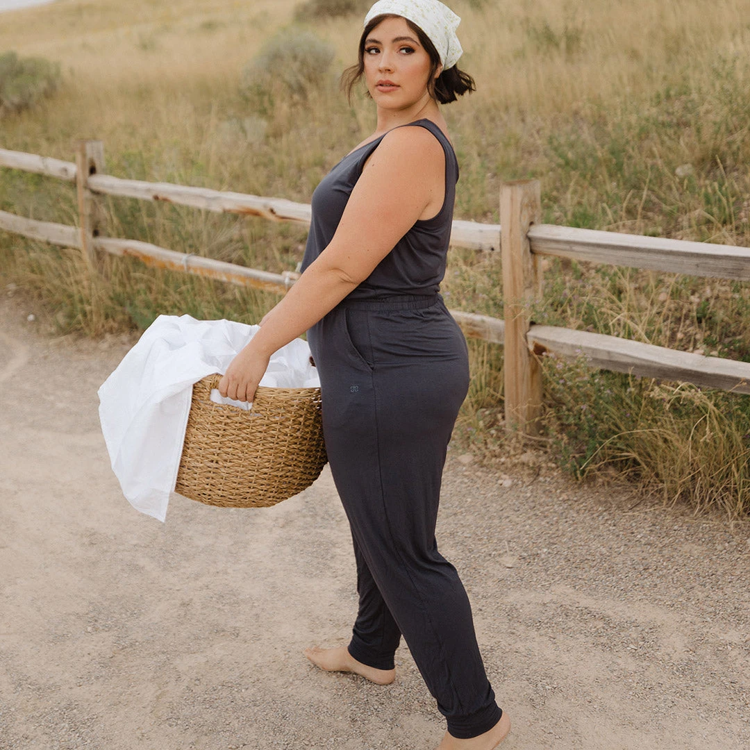 A classic grey for a classic look. This go-anywhere or stay at home women’s jumpsuit is going to be your go-to! Made in our best-selling, softest-ever, bamboo fabric, you’ll never want to take it off. Complete with figure flattering elastic and drawstring waistband, and a scoop neckline to fit any body. Pair it with your favorite sneakers and Albion bomber for going out!
